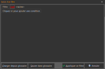 Cette fenêtre permet de construire un filtre à partir d'un assistant. Il faut créer autant de conditions et de groupes de conditions nécessaires pour construire le filtre désiré.