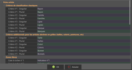 Classification des articles : ces 8 zones alphanumériques permettent de personnaliser le libellé des 4 critères de classifications qui sont appelés, par défaut, < Rayon >, < Famille >, < Ligne > et <marque>. La colonne de gauche correspond aux libellés accordés au singulier et celle de droite, aux libellés accordés au pluriel.