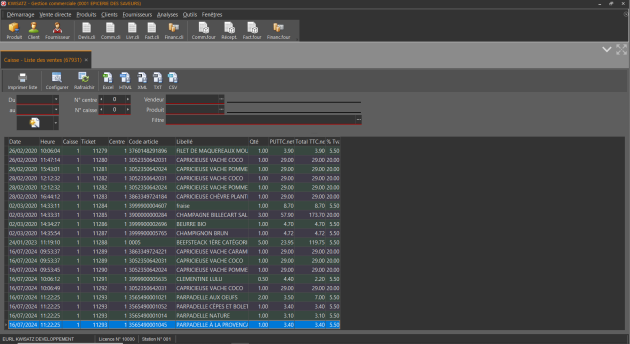 Un clic sur cette ligne ouvre une fenêtre permettant de consulter la liste des ventes de produits et d'effectuer des recherches selon divers critères.